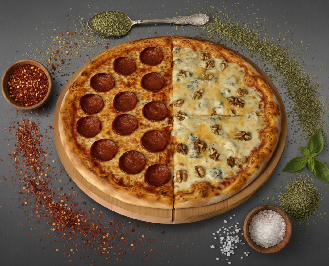 Combină oricare două sortimente din pizzele noastre clasice de mai sus.